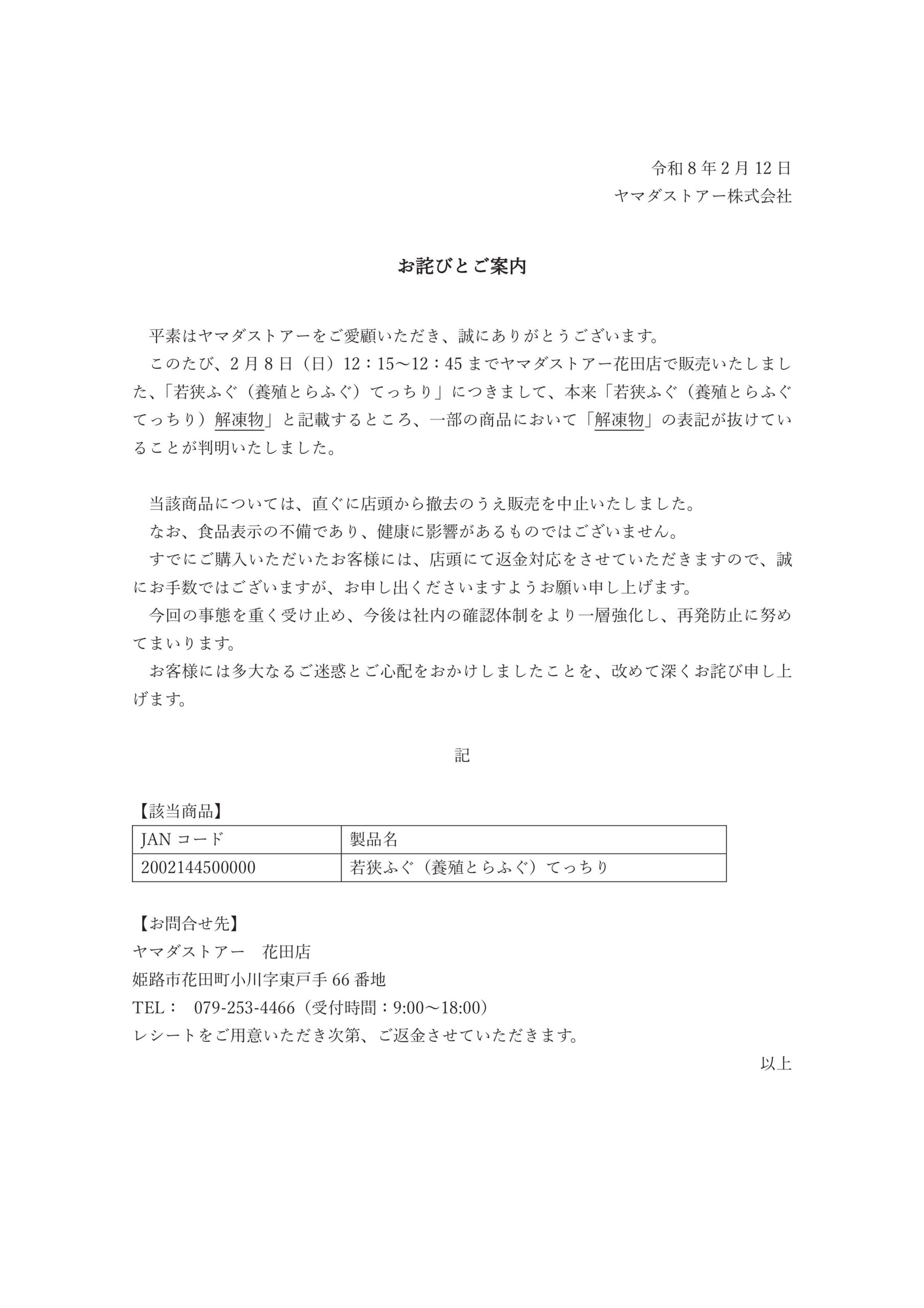 このたび、2月8日(日)12:15~12:45までヤマダストアー花田店で販売いたしました、「若狭ふぐ(養殖とらふぐ)てっちり」につきまして、本来「若狭ふぐ(養殖とらふぐてっちり)解凍物」と記載するところ、一部の商品において「解凍物」の表記が抜けていることが判明いたしました。