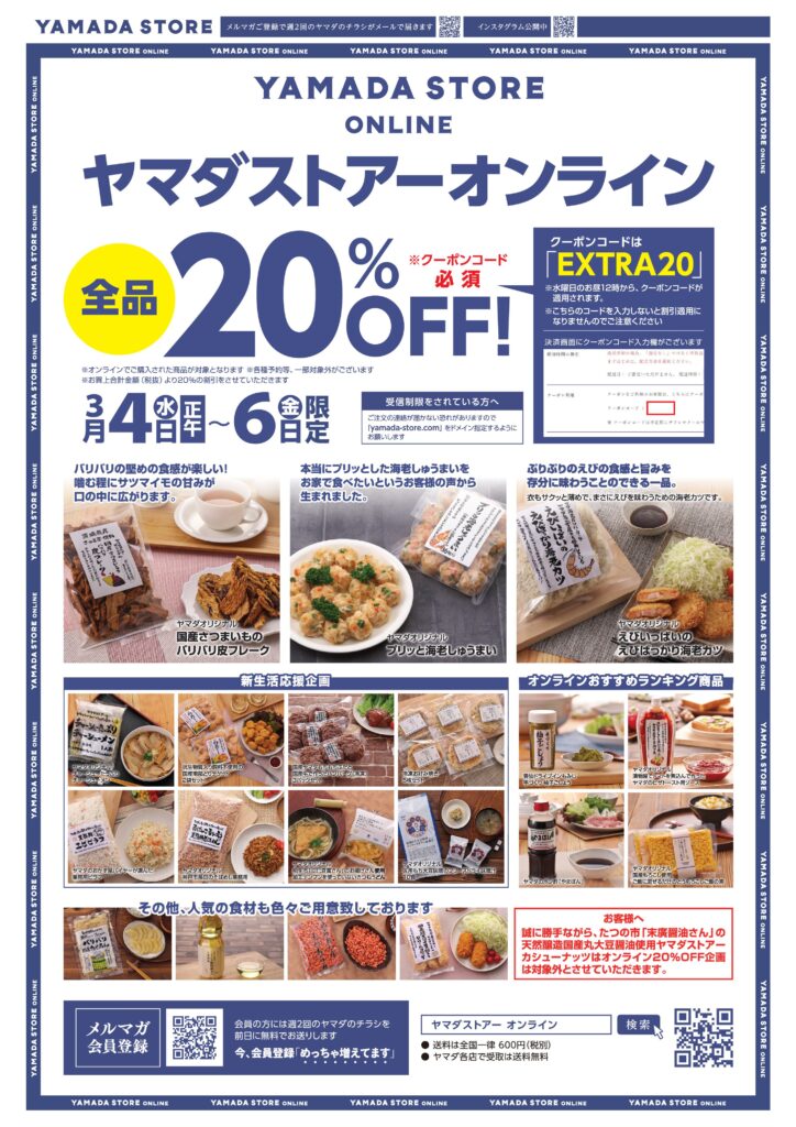 3月4日(水)ヤマダストアーオンライン20%OFFのお知らせ